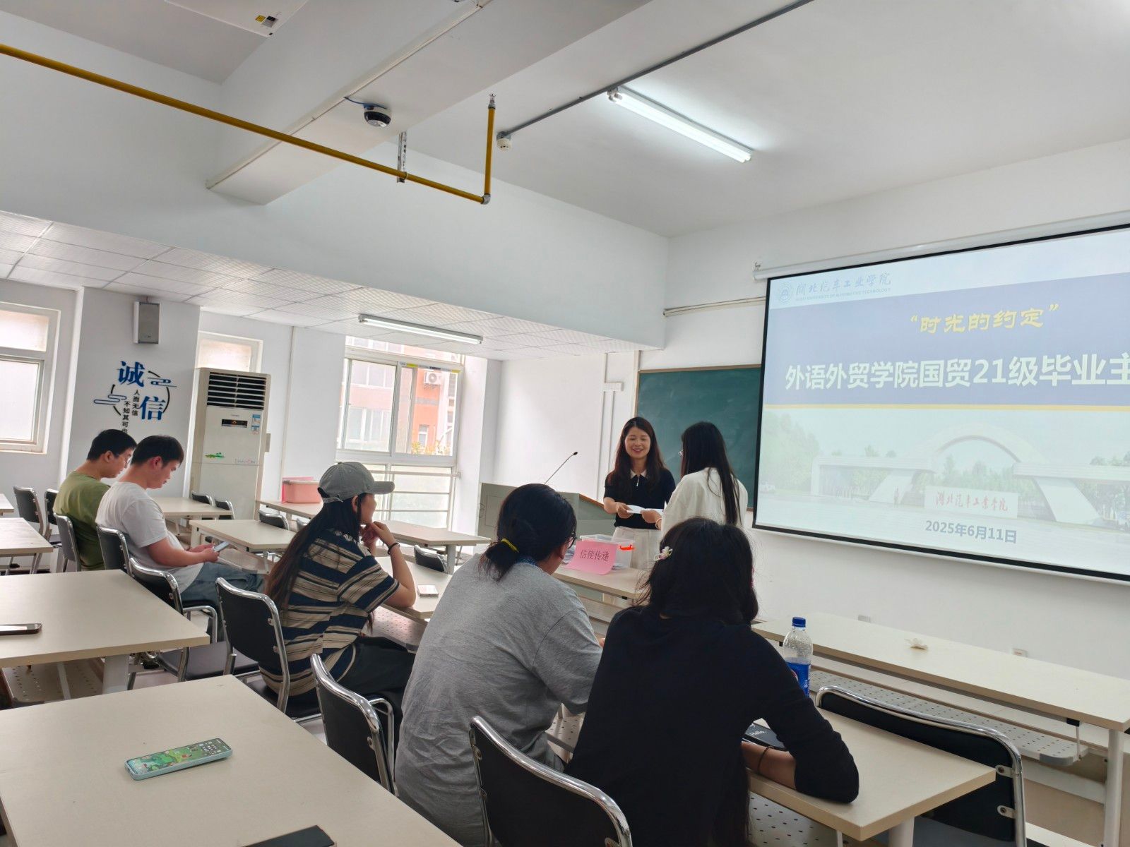 6月11日下午,武汉产学研基地204教室内,外语外贸学院国贸212班“时光的约定”主题班会正温情上演。国贸212班李铭楷手捧大一入学时写下的信件,用这段跨越时光的成长独白,拉开了这场联结过去与未来的特别聚会的序幕。